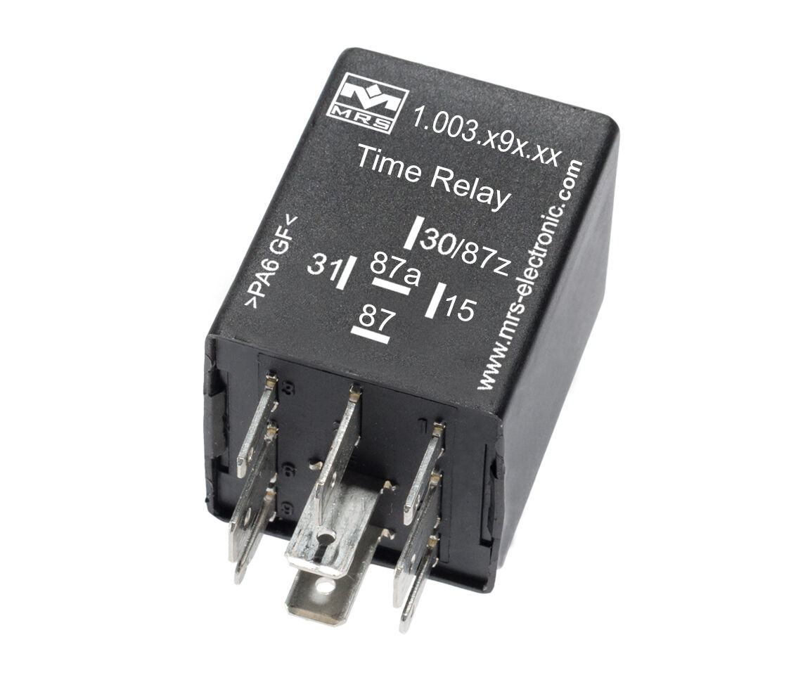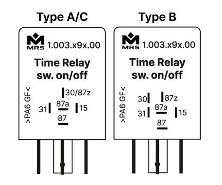 Time relays with switch on and off delay can be used if consumers are to be switched on and off time-delayed. Please indicate the desired tightening and waste delay time when ordering. All schematics: Operating voltage is applied to terminal 30/87z. If the voltage is set at Terminal 15, the relay will pull on at the end of the specified time. If the voltage is removed at Terminal 15, the relay falls off after the specified time has elapsed.