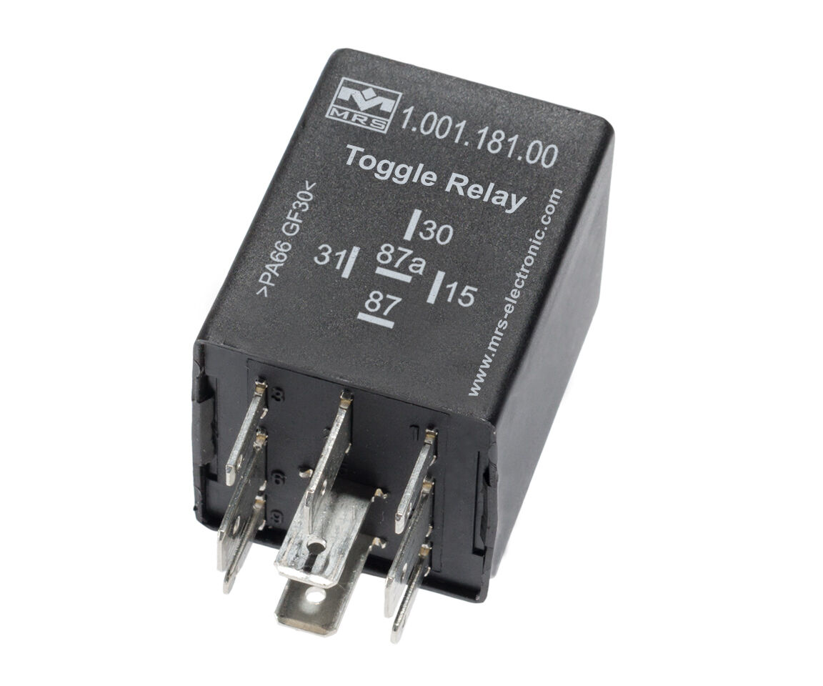 The Toggle Relay is used to switch loads on and off via pushbutton operation. Circuit diagram S1: With the step switching relay a consumer can be switched via a button. If a positive/negative impulse is applied to Terminal 15, the relay switches and holds itself. Another impulse is switched on again (Power surge switch or toggle flip-flop). The terminal 15 is debounced. Circuit diagram S2: The contacts are separate from the control and can therefore be used in links. In this variant, the relay contact is completely potential-free and thus capable of switching alternating voltage. Housing forms can be found in the section housing and basic body.