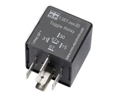 The Toggle Relay is used to switch loads on and off via pushbutton operation. Circuit diagram S1: With the step switching relay a consumer can be switched via a button. If a positive/negative impulse is applied to Terminal 15, the relay switches and holds itself. Another impulse is switched on again (Power surge switch or toggle flip-flop). The terminal 15 is debounced. Circuit diagram S2: The contacts are separate from the control and can therefore be used in links. In this variant, the relay contact is completely potential-free and thus capable of switching alternating voltage. Housing forms can be found in the section housing and basic body.