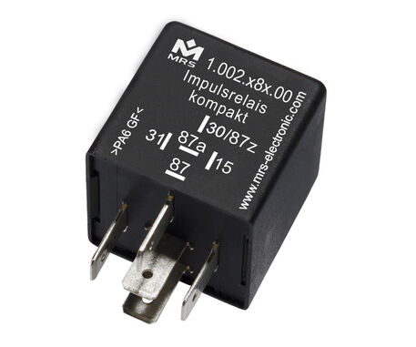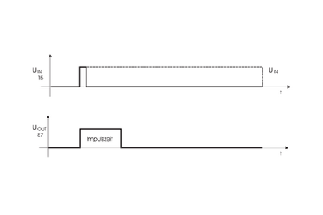 Impulsrelaiskompakt finden Einsatz, wenn Verbraucher für eine definierte Zeit ein- oder ausgeschaltet werden sollen. Bitte geben Sie bei der Bestellung die gewünschte Impulszeiten an. Schaltbild S1 und S2: An Klemme 30 wird Betriebsspannung angelegt. Wird an Klemme 15 Spannung angelegt, zieht das Relais unmittelbar für die angegebene Zeit an und fällt danach wieder ab. Die Dauer des Ansteuersignals hat keinen Einfluss auf die Ausgangsimpulsdauer (d.h. das Relais ist nicht nachtriggerbar).