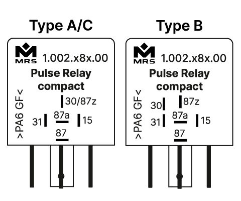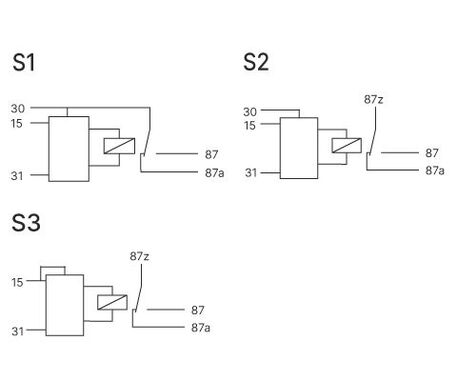 Schaltbild S3: An Klemme 87z wird Betriebsspannung angelegt. Wird an Klemme 15 Spannung angelegt, zieht das Relais unmittelbar für die angegebene Zeit an und fällt danach wieder ab. Schaltbild S2 und S3: Die Kontakte sind getrennt von der Ansteuerung und können daher in Verknüpfungen eingesetzt werden. Bei dieser Variante ist der Relaiskontakt komplett potentialfrei und somit in der Lage Wechselspannung zu schalten. Gehäuseformen finden Sie im Kapitel Gehäuse und Grundkörper.