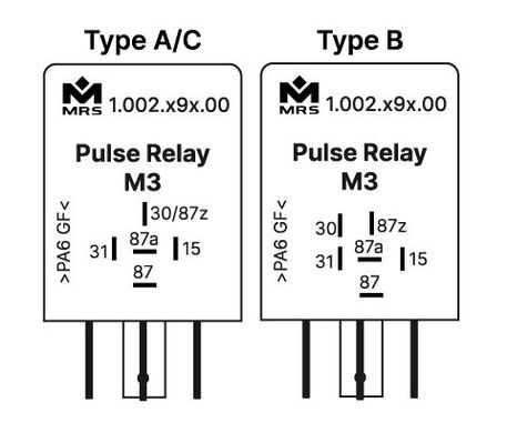 Impulsrelais M3 finden Einsatz, wenn Verbraucher für eine definierte Zeit ein- oder ausgeschaltet werden sollen. Bitte geben Sie bei der Bestellung die gewünschte Impulszeiten an. Schaltbild S1 und S2: An Klemme 30 wird Betriebsspannung angelegt. Wird an Klemme 15 Spannung angelegt, zieht das Relais unmittelbar für die angegebene Zeit an und fällt danach wieder ab. Die Dauer des Ansteuersignals hat keinen Einfluss auf die Ausgangsimpulsdauer (d.h. das Relais ist nicht nachtriggerbar).