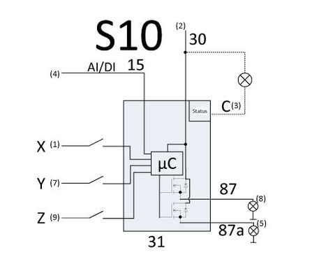 E1 EA1 2×442, 3 digitale 1 analoger Eingang, 2 Highside Ausgänge, 1 open collector Ausgang, Typ A, Verbindung S10