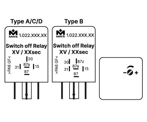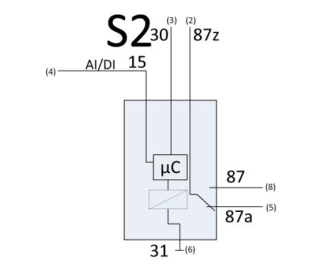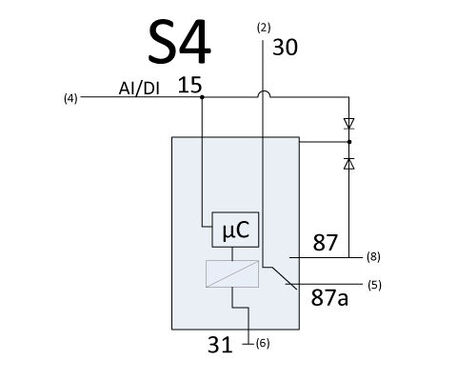 Alle Schaltbilder: An Klemme 30/87z wird Betriebsspannung angelegt. Wird an Klemme 15 Spannung angelegt, zieht das Relais unmittelbar an. Wird die Spannung an Klemme 15 weggenommen, fällt das Relais nach Ablauf der eingestellten Zeit ab. Schaltbild S4: Das Relais verbraucht durch die Diodenbeschaltung nach dem Abfallen keinen Ruhestrom. Gehäuseformen finden Sie im Kapitel Gehäuse und Grundkörper.