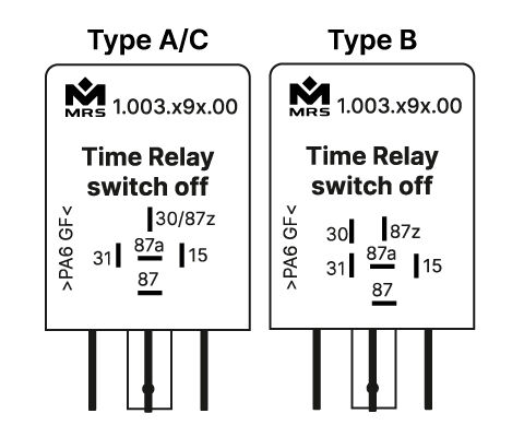 Zeitrelais abfallverzögert M3 schalten Verbraucher nach Ablauf der vorgegeben Verzögerungszeit ein. Bitte geben Sie bei der Bestellung die gewünschte Verzögerungszeit an. Alle Schaltbilder: An Klemme 30/87z wird Betriebsspannung angelegt. Wird an Klemme 15 Spannung angelegt, zieht das Relais unmittelbar an. Wird die Spannung an Klemme 15 weggenommen fällt das Relais nach Ablauf der vorgegeben Zeit ab.